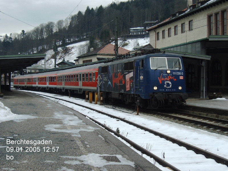 111 030 wartet am 09.01.2005 in Berchtesgaden auf Abfahrt in Richtung Freilassing ...