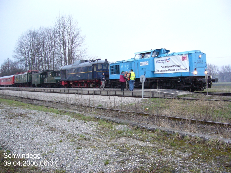 202 563 ist zu einem Wartungshalt mit Überführung der V140 001, LAG1, D 2/2, E16 07 und B IX 1000nach Freilassing in Schwindegg eingetroffen