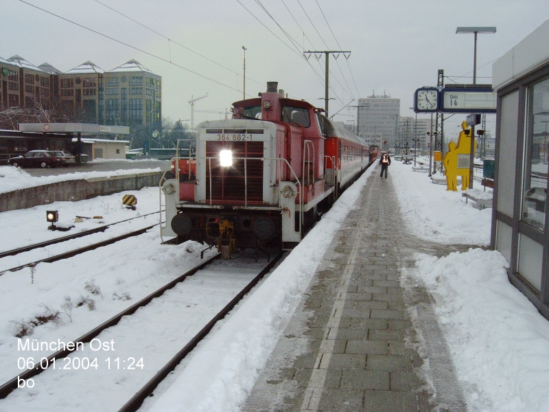 München Ost, 06.01.2004: 364 882 hat soeben Schlaf- und Autozugwaggons zur 120 129 gebracht, die mit diesen in Kürze Richtung Südring verschwindet......und weit entfernt in der anderen Richtung ist Berchtesgaden...